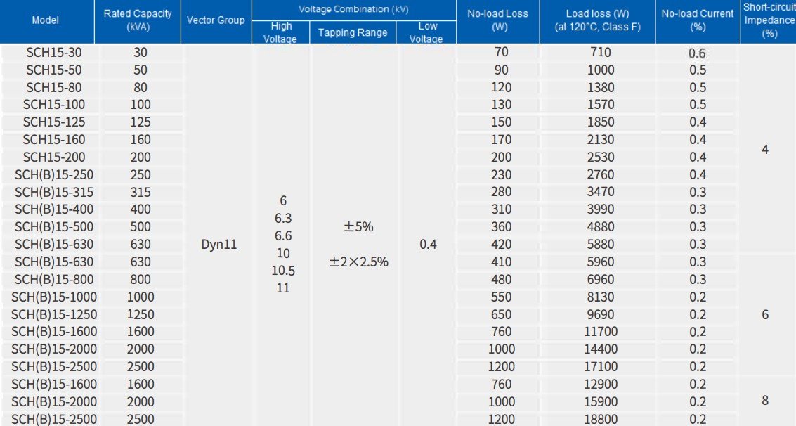 SC(B)H15 Series Amorphous Alloy Dry-Type Transformer - Main Performance Parameters
